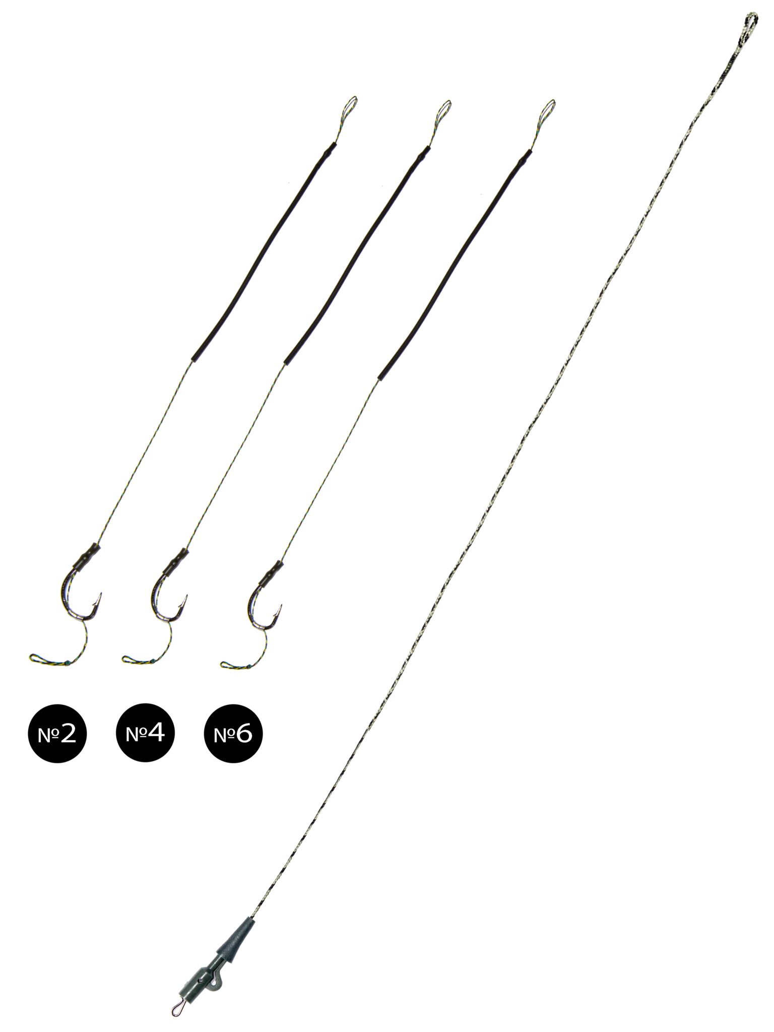 В наборе предлагается 3 карповых поводка под бойл длиной 20см. Крючки №2, 4, 6